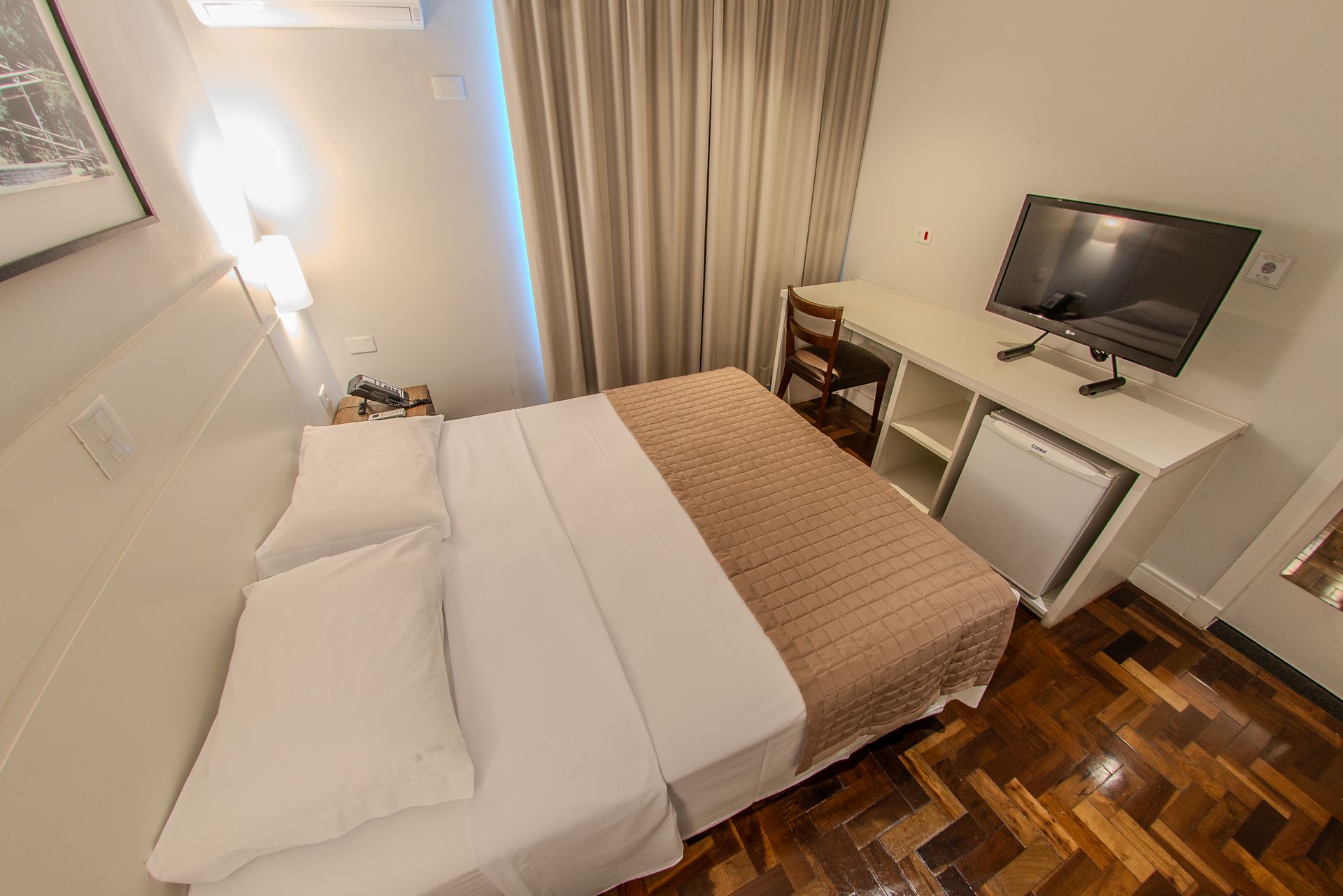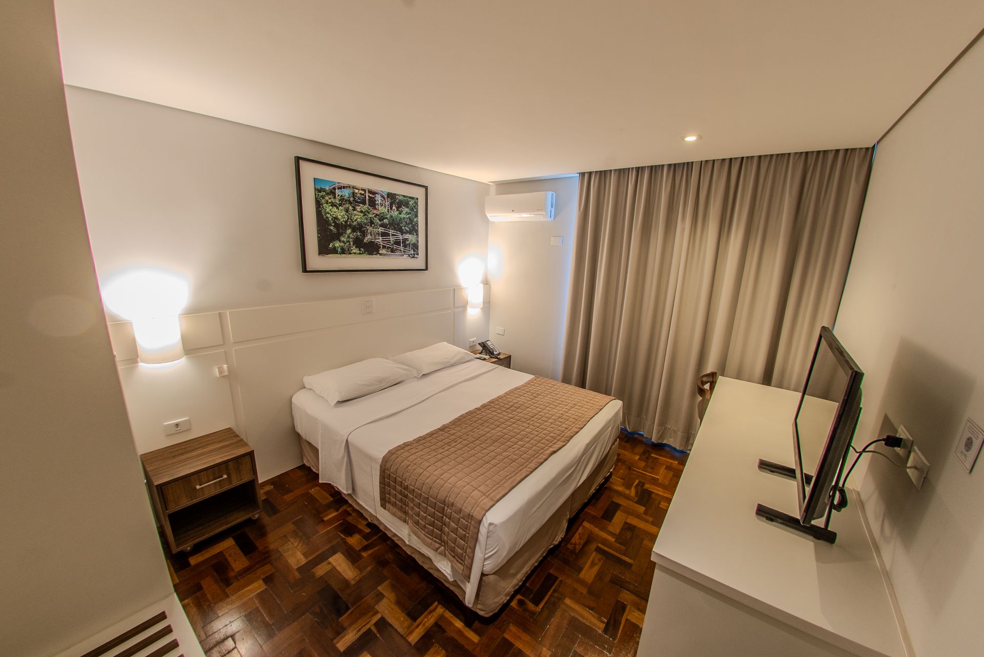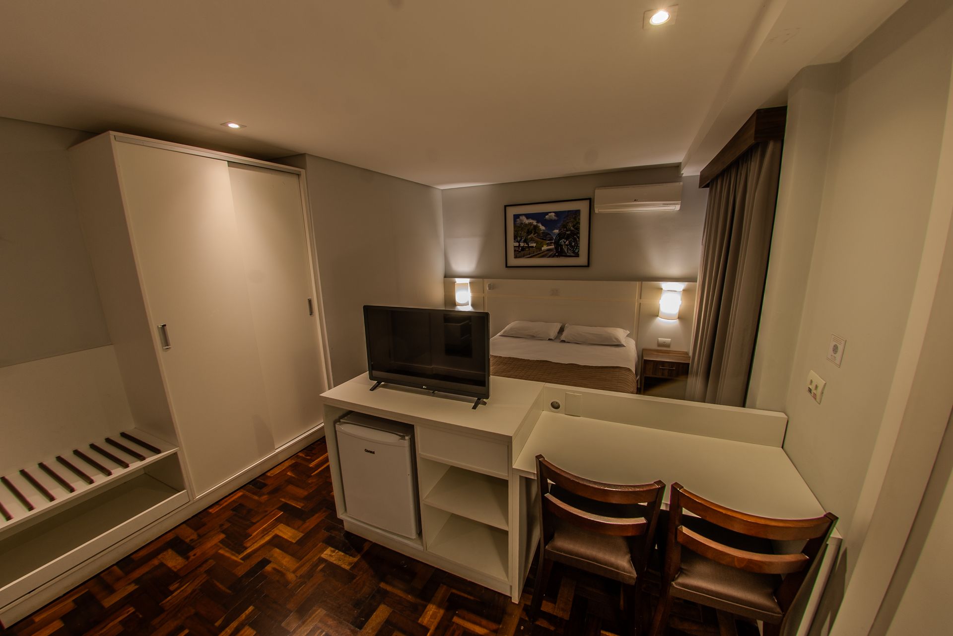 Apartamento com 1 cama box de casal, mesa de trabalho, televisão, ar-condicionado split, cofre e frigobar. O banheiro privativo inclui chuveiro e secador de cabelo.