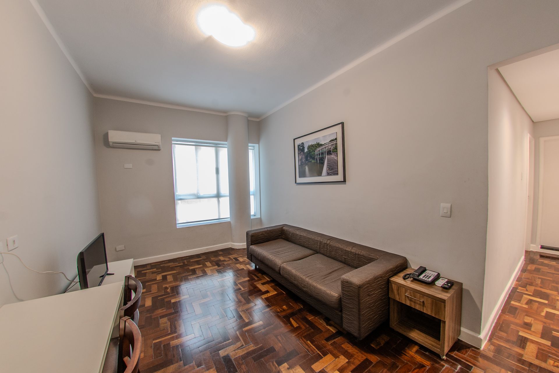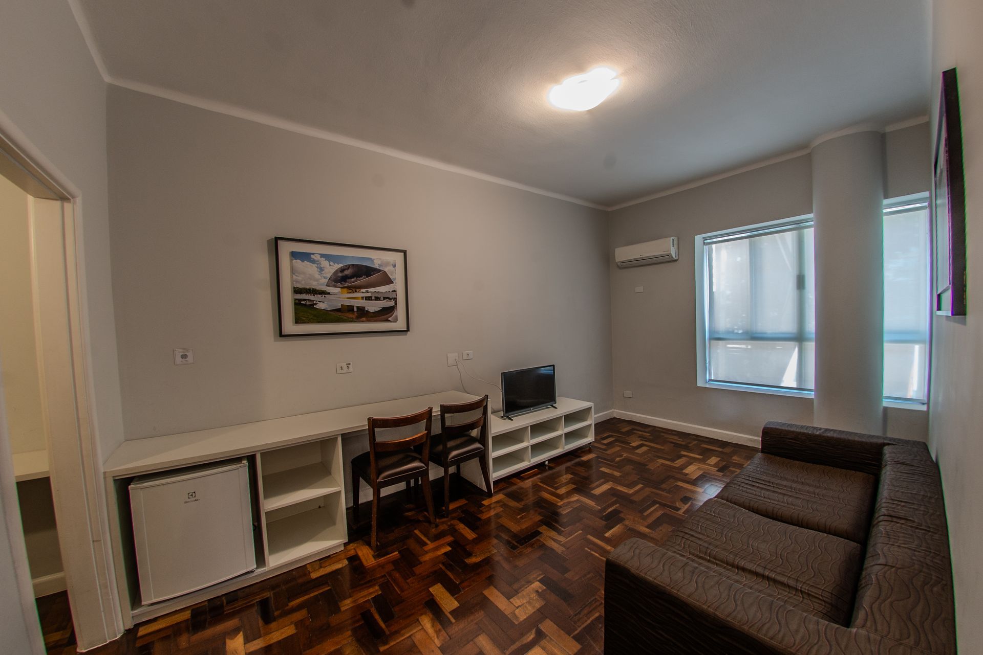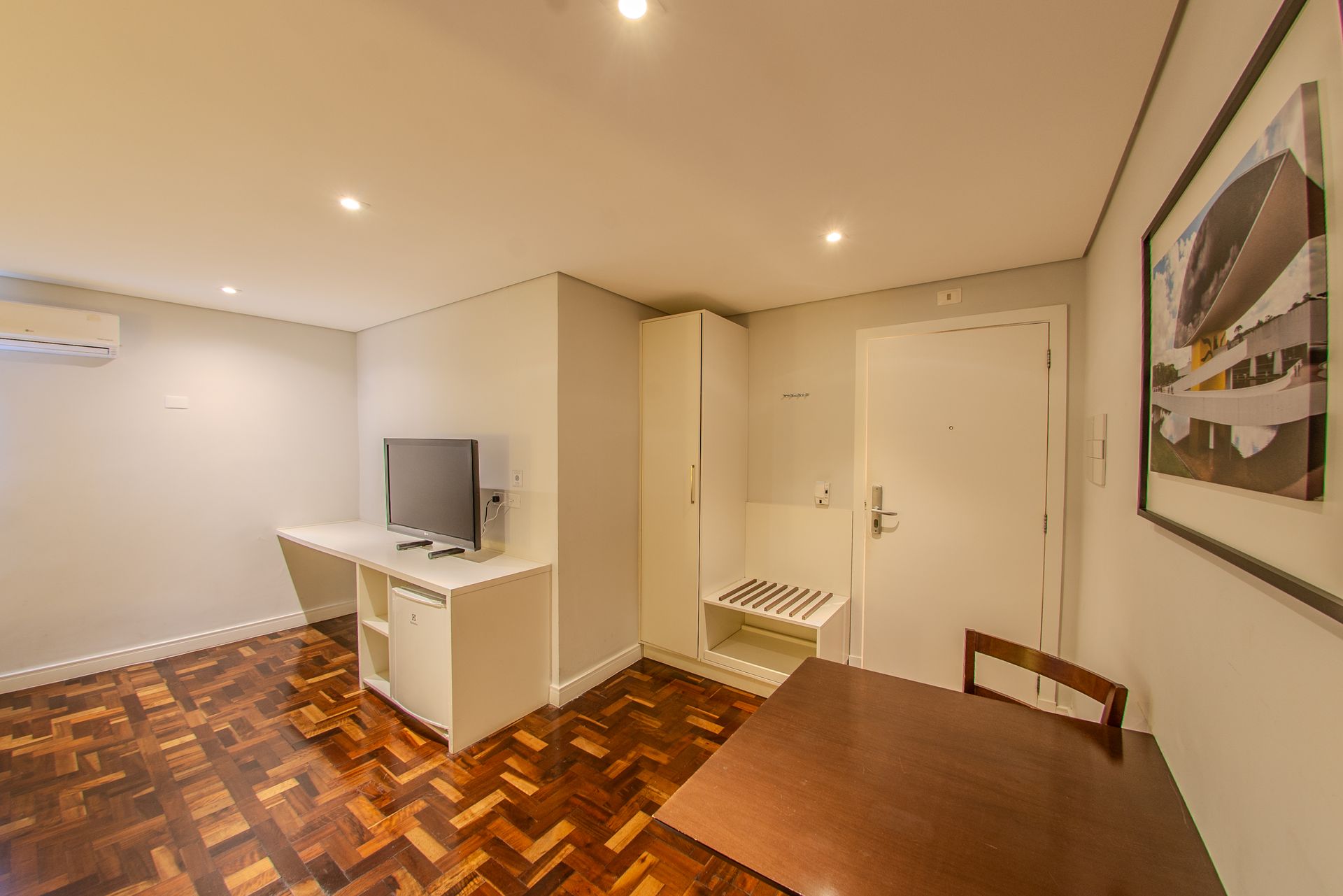 Apartamento com 1 cama box de casal, mesa de trabalho, televisão, ar-condicionado split, cofre e frigobar. O banheiro privativo inclui chuveiro e secador de cabelo.