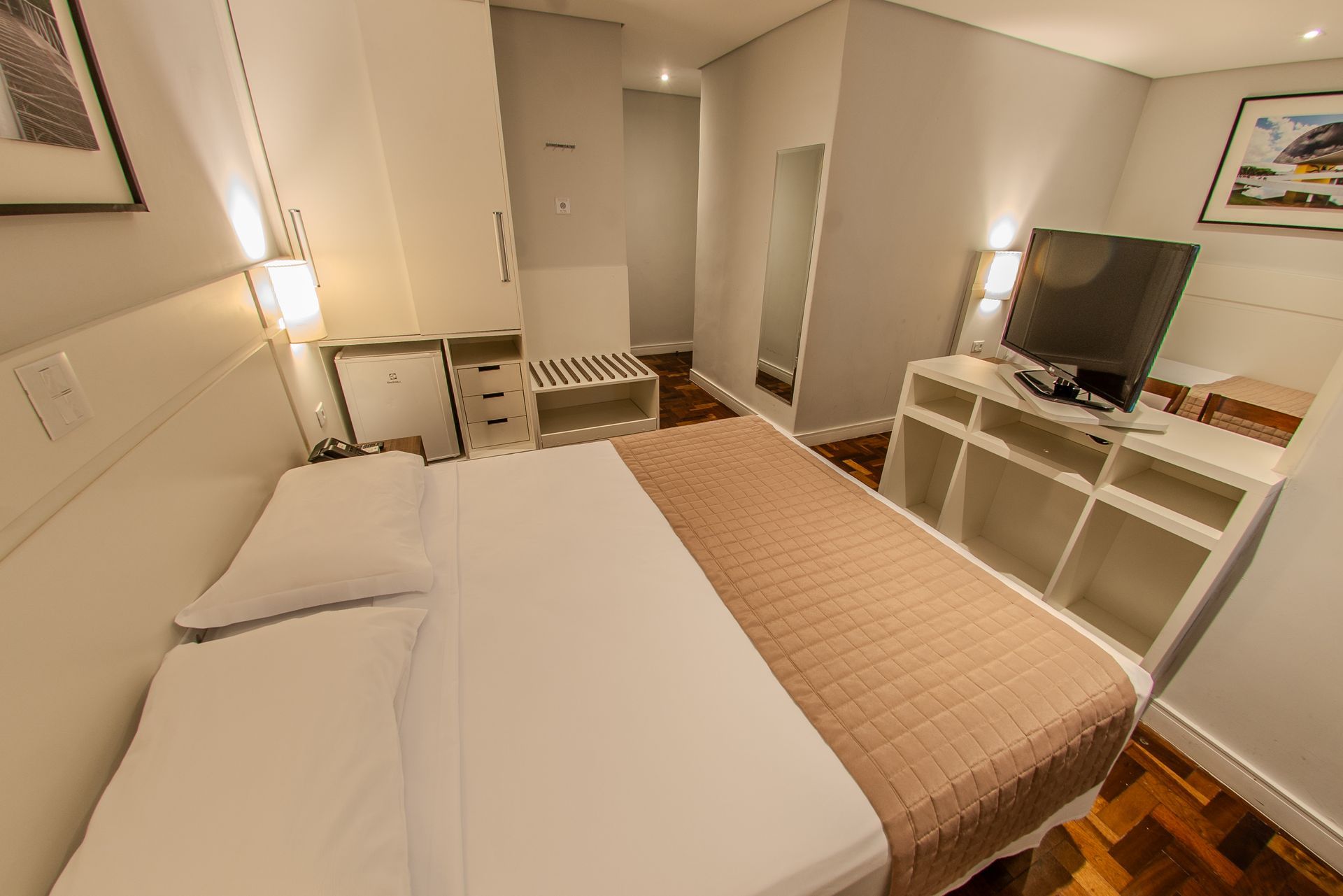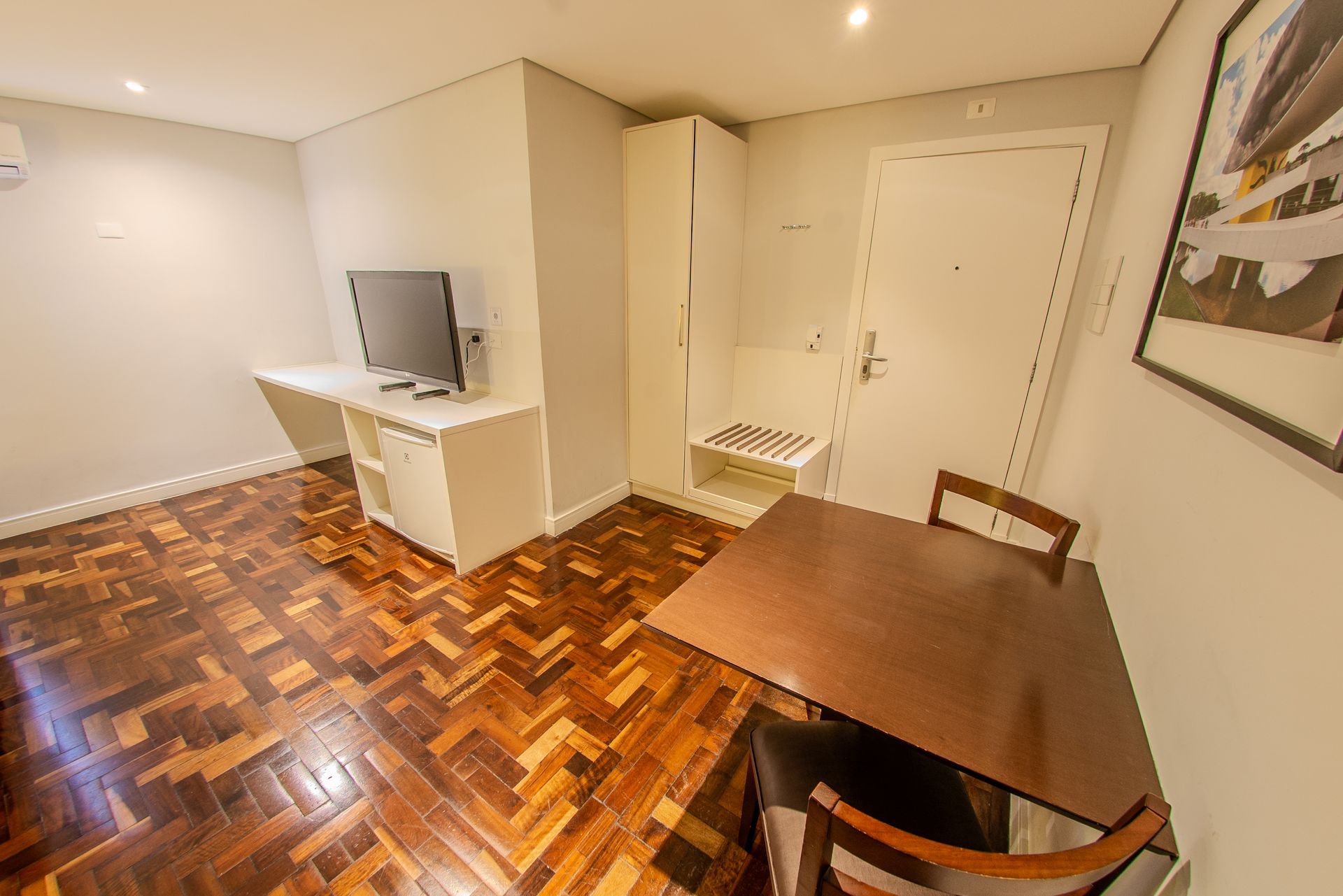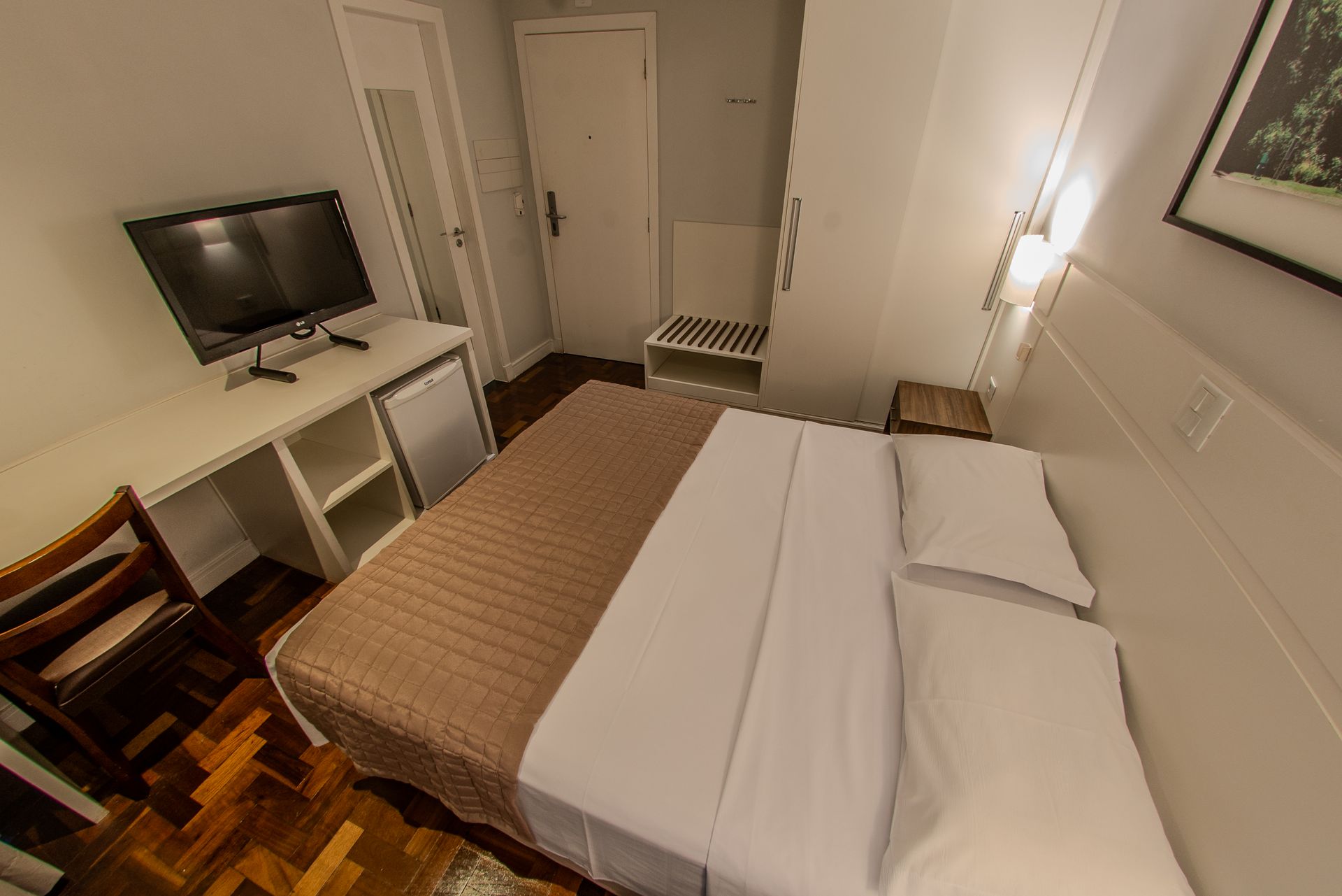 Apartamento com 1 cama Box de casal, mesa de trabalho, televisão, ar condicionado split, cofre e frigobar. O banheiro privativo inclui chuveiro e secador de cabelo.