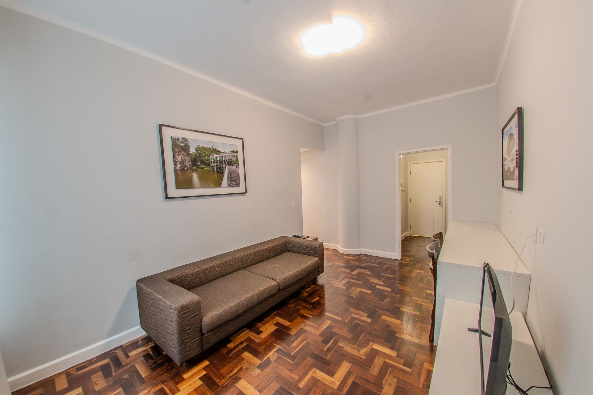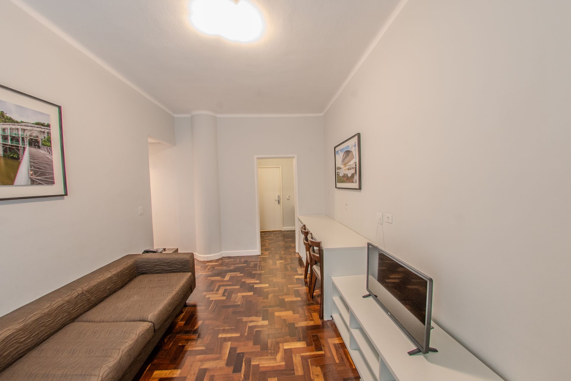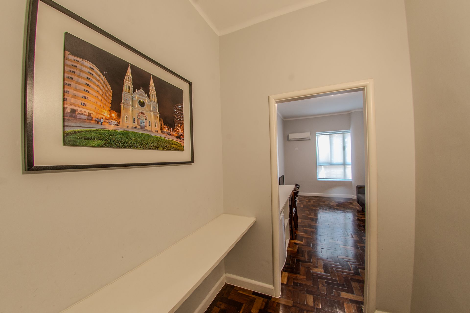 Apartamento com vista para Praça Osório, com uma sala equipada com: ar condicionado split, televisão, sofá, mesa de trabalho e frigobar. Quarto com 1 cama box de casal e 2 camas box de solteiro, televisão, ar-condicionado split e cofre. O banheiro privativo inclui chuveiro e secador de cabelo.