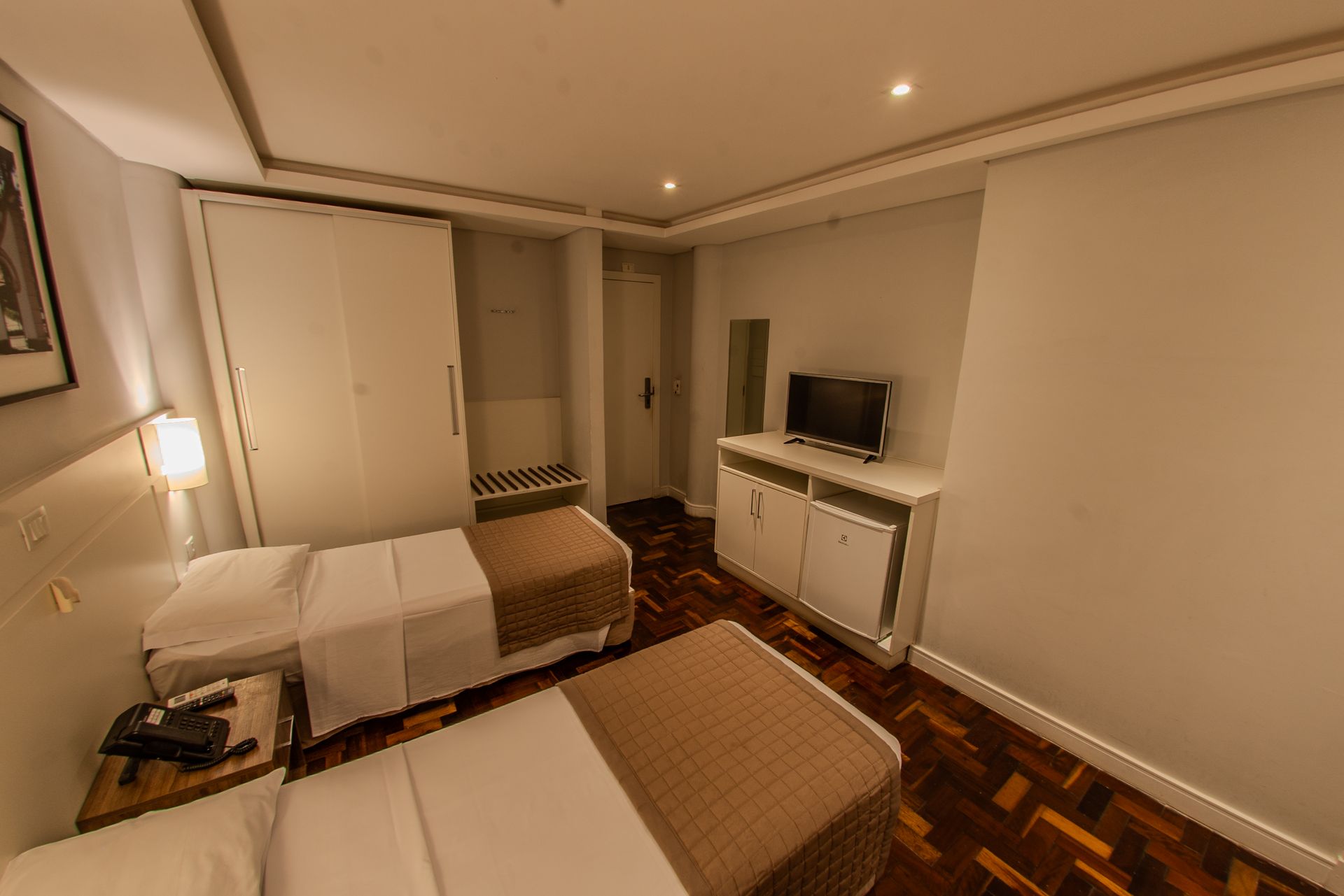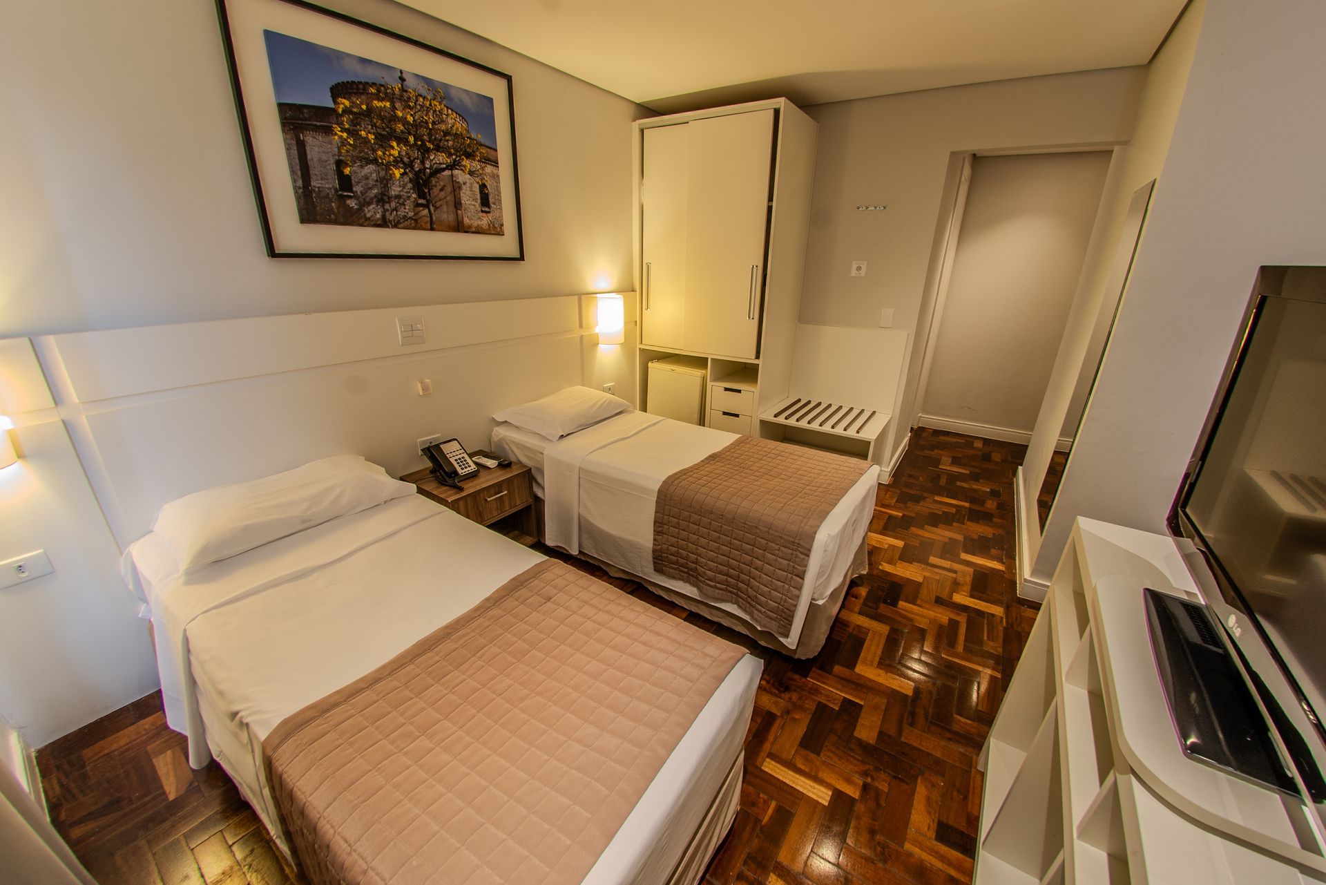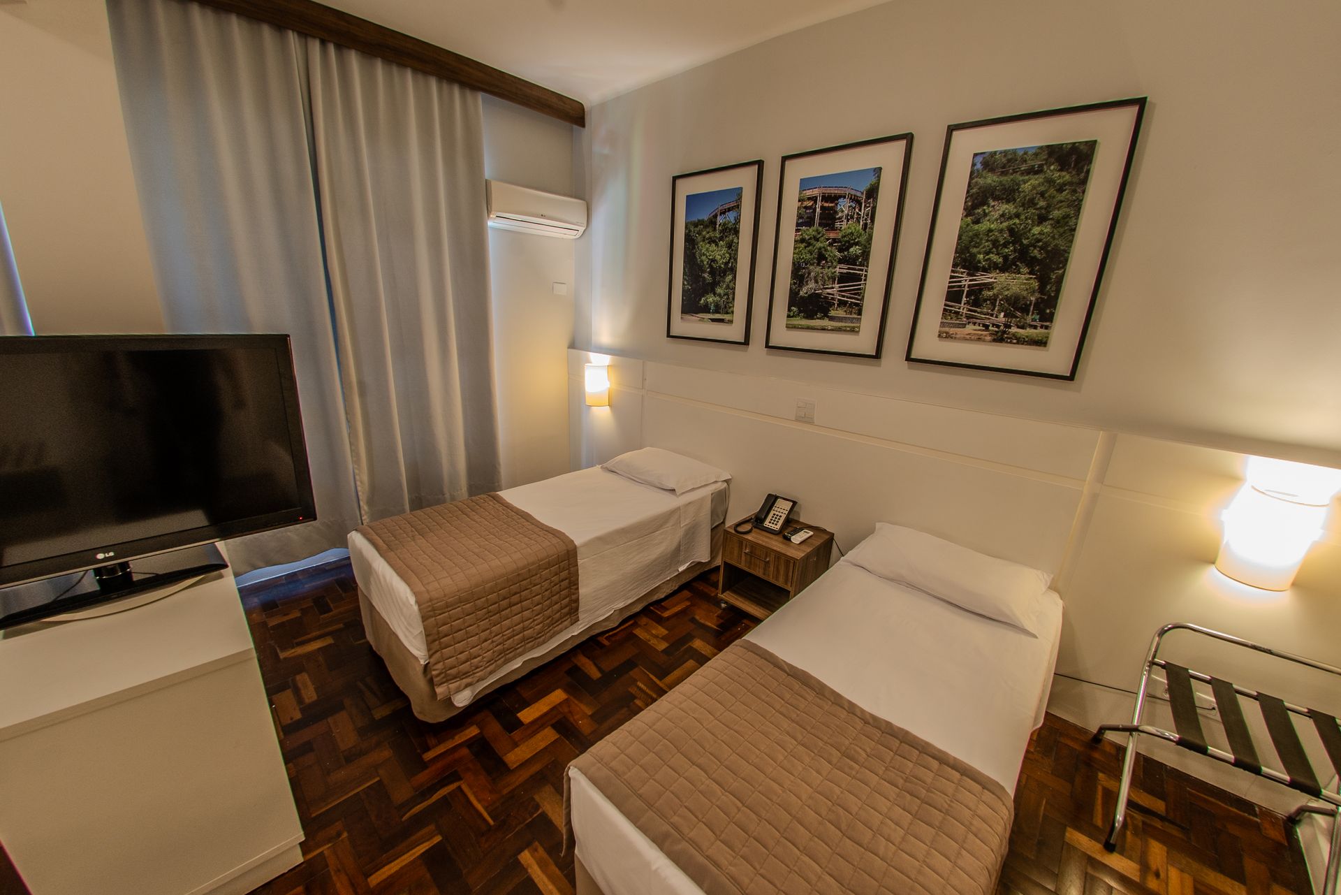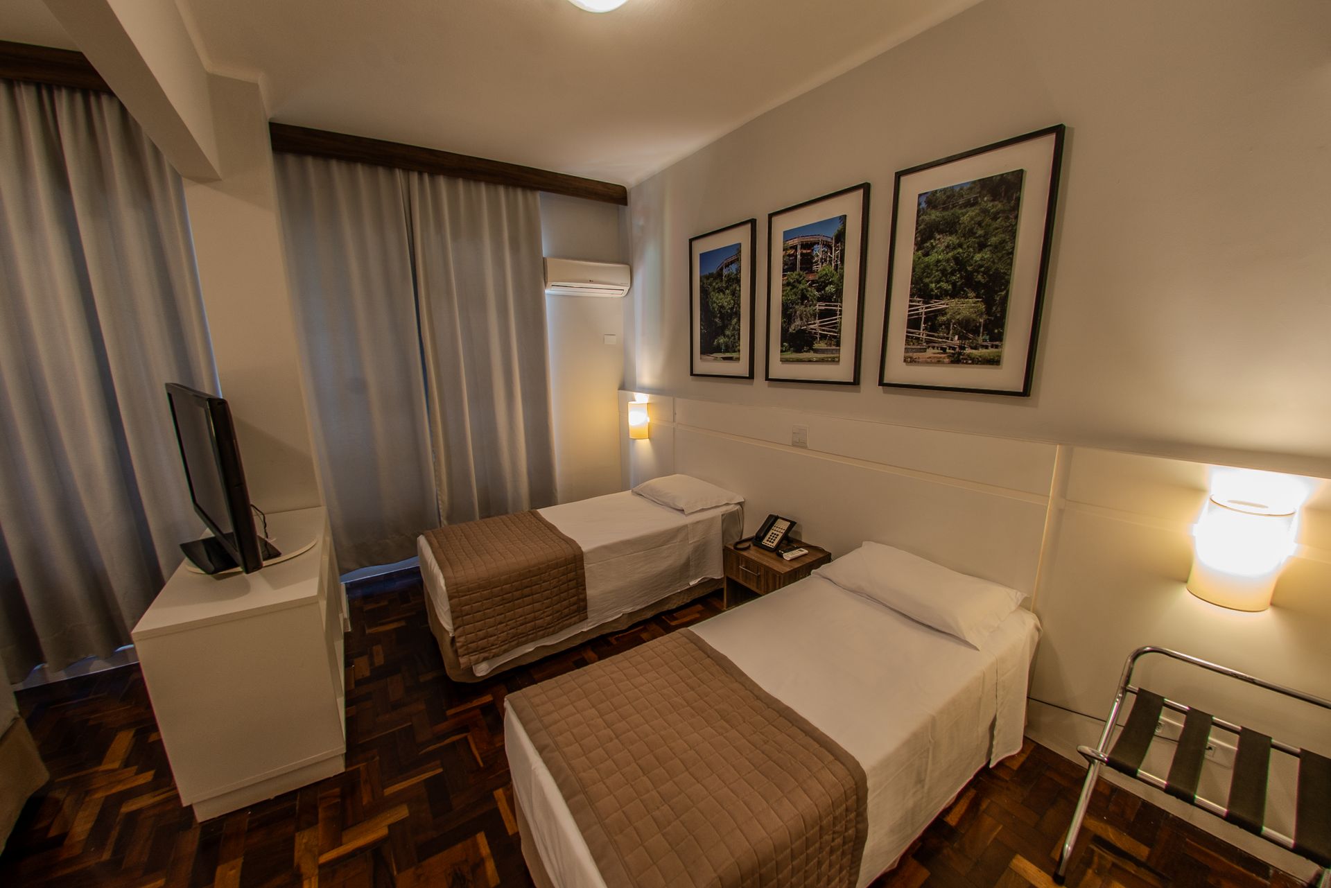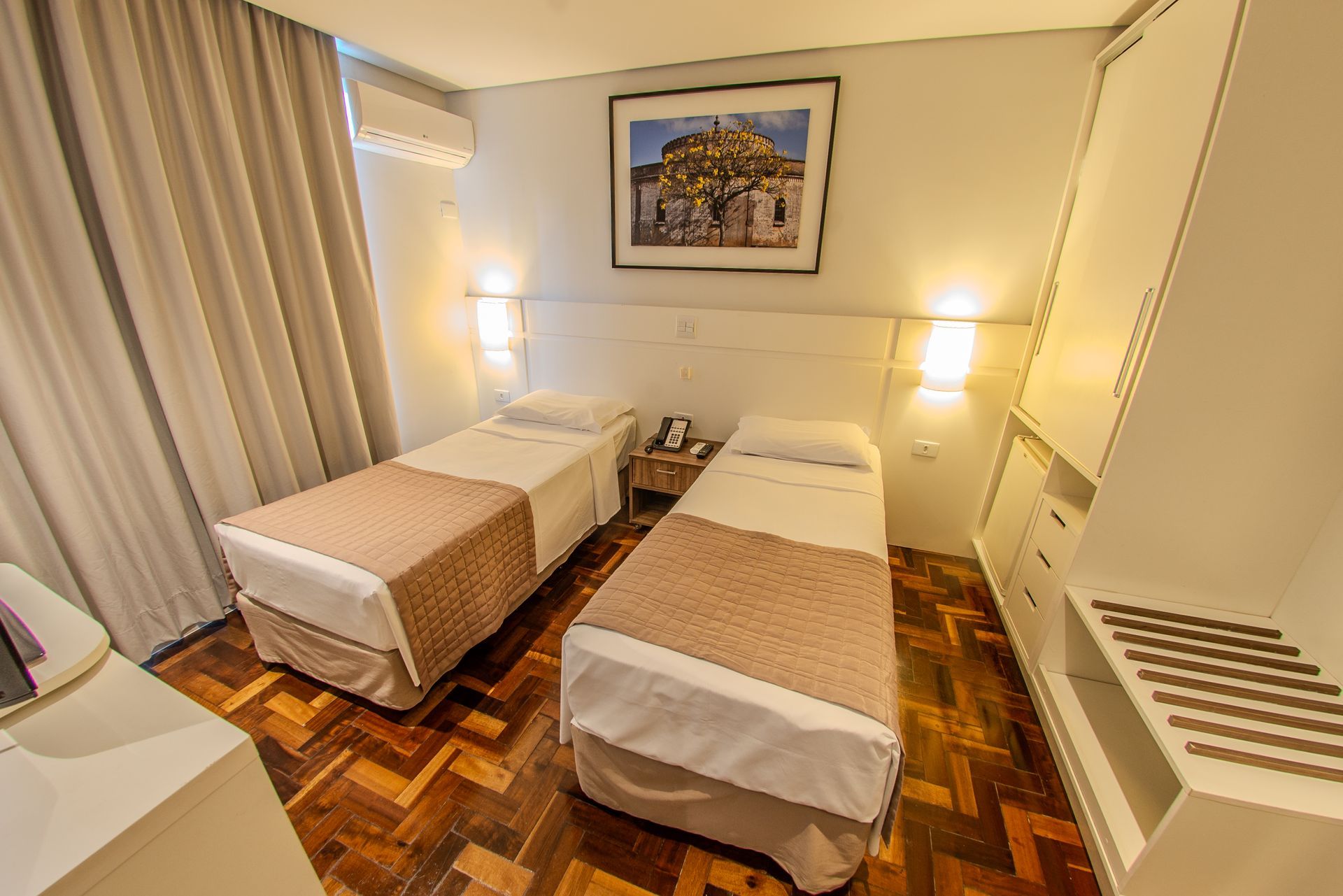 Apartamento com 2 camas box de solteiro, mesa de trabalho, televisão, ar-condicionado split, cofre e frigobar. O banheiro privativo inclui chuveiro e secador de cabelo.