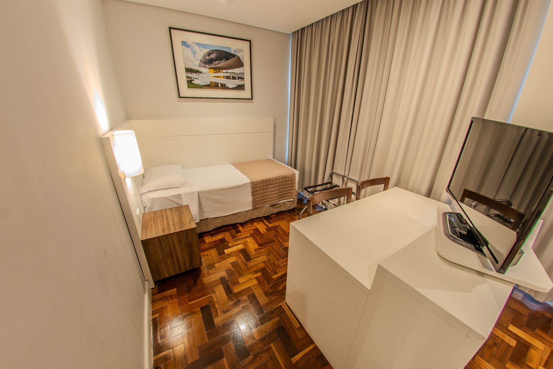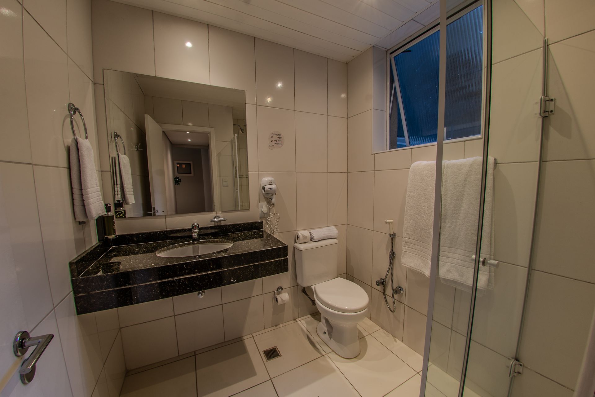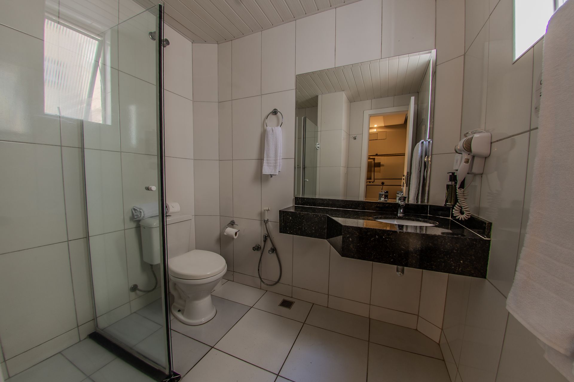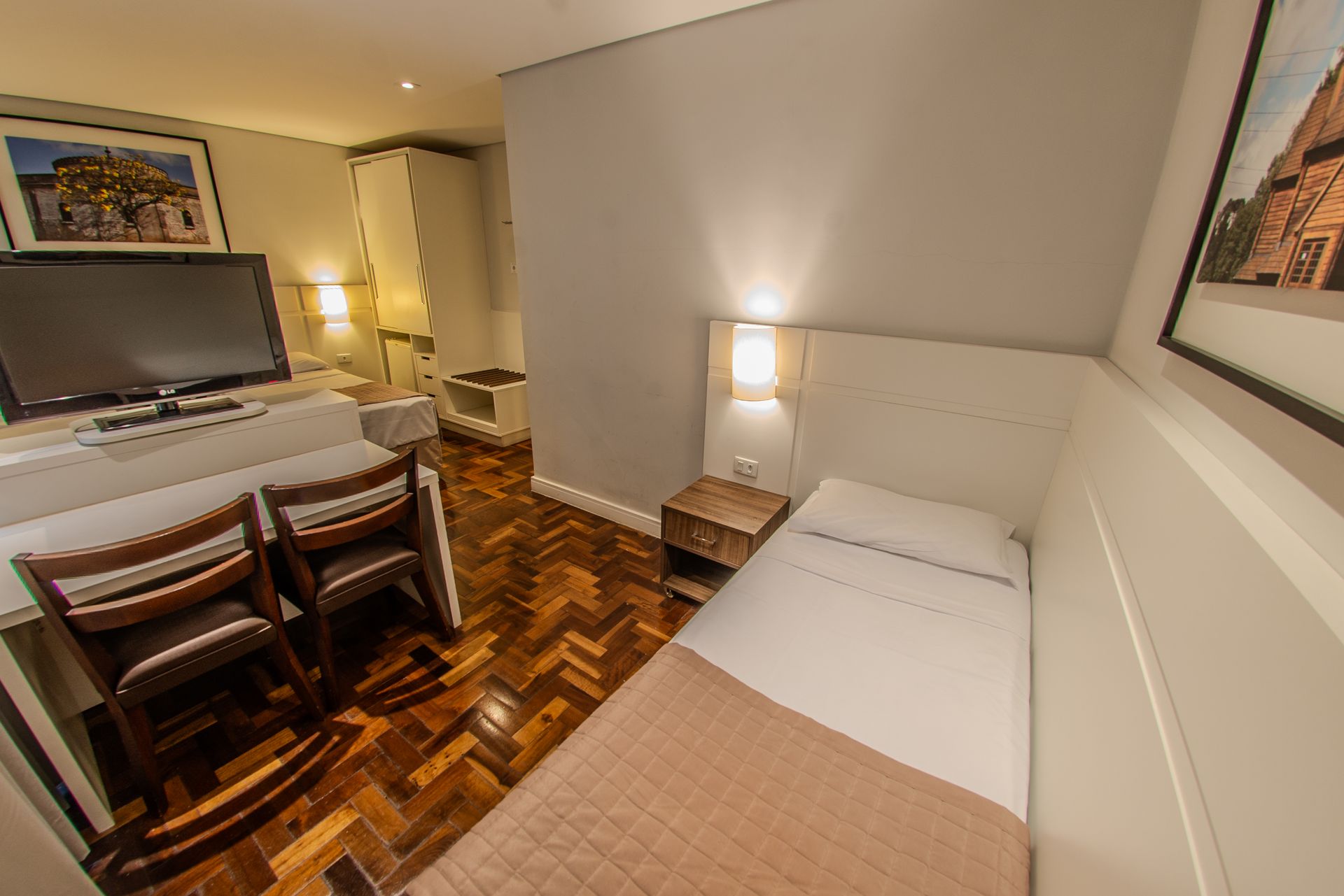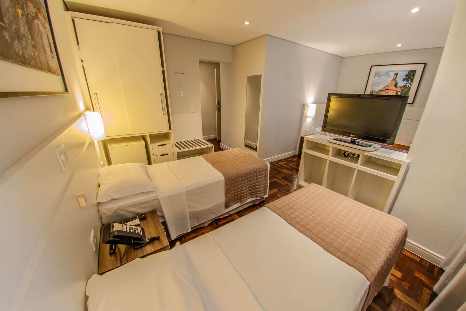 Apartamento com 2 camas box de solteiro, mesa de trabalho, televisão, ar-condicionado split, cofre e frigobar. O banheiro privativo inclui chuveiro e secador de cabelo.