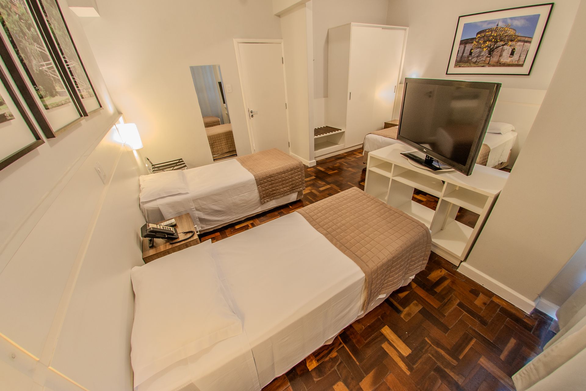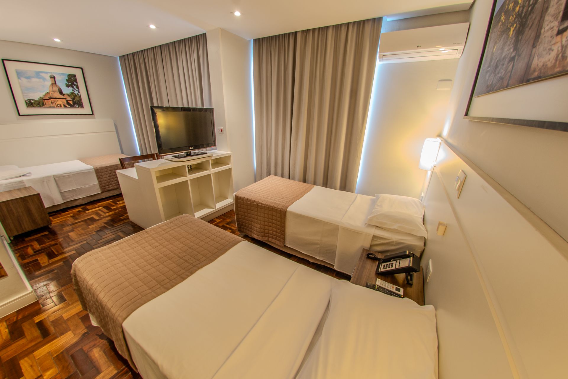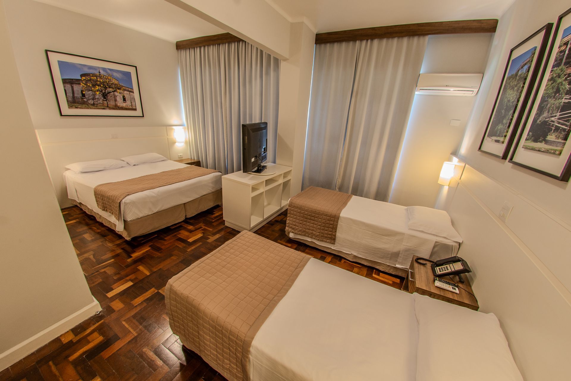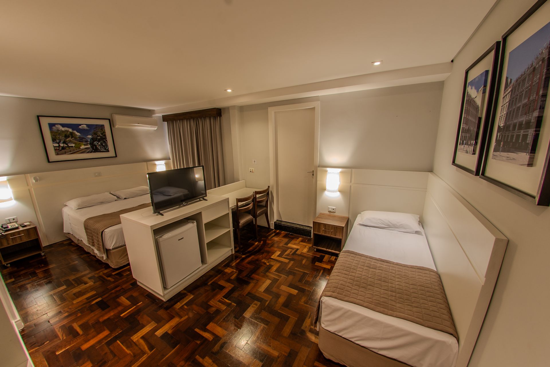 Apartamento com 3 camas de solteiro, mesa de trabalho, televisão, ar-condicionado split, cofre e frigobar. O banheiro privativo inclui chuveiro e secador de cabelo.