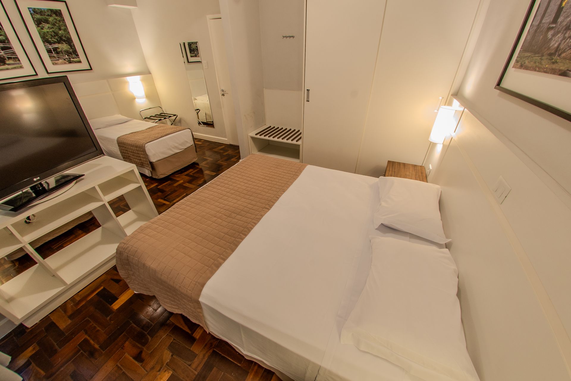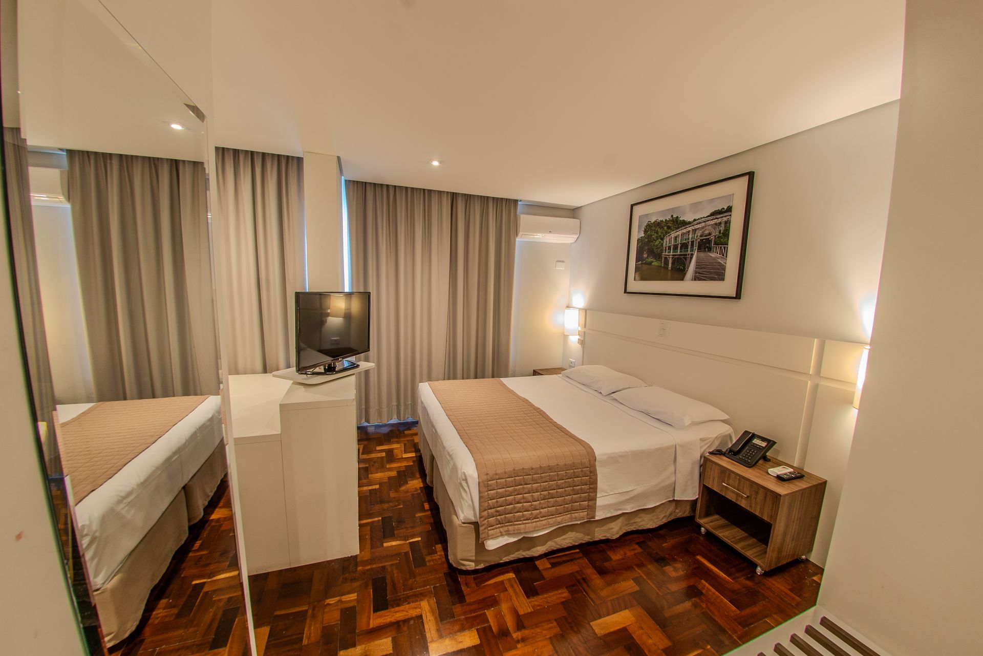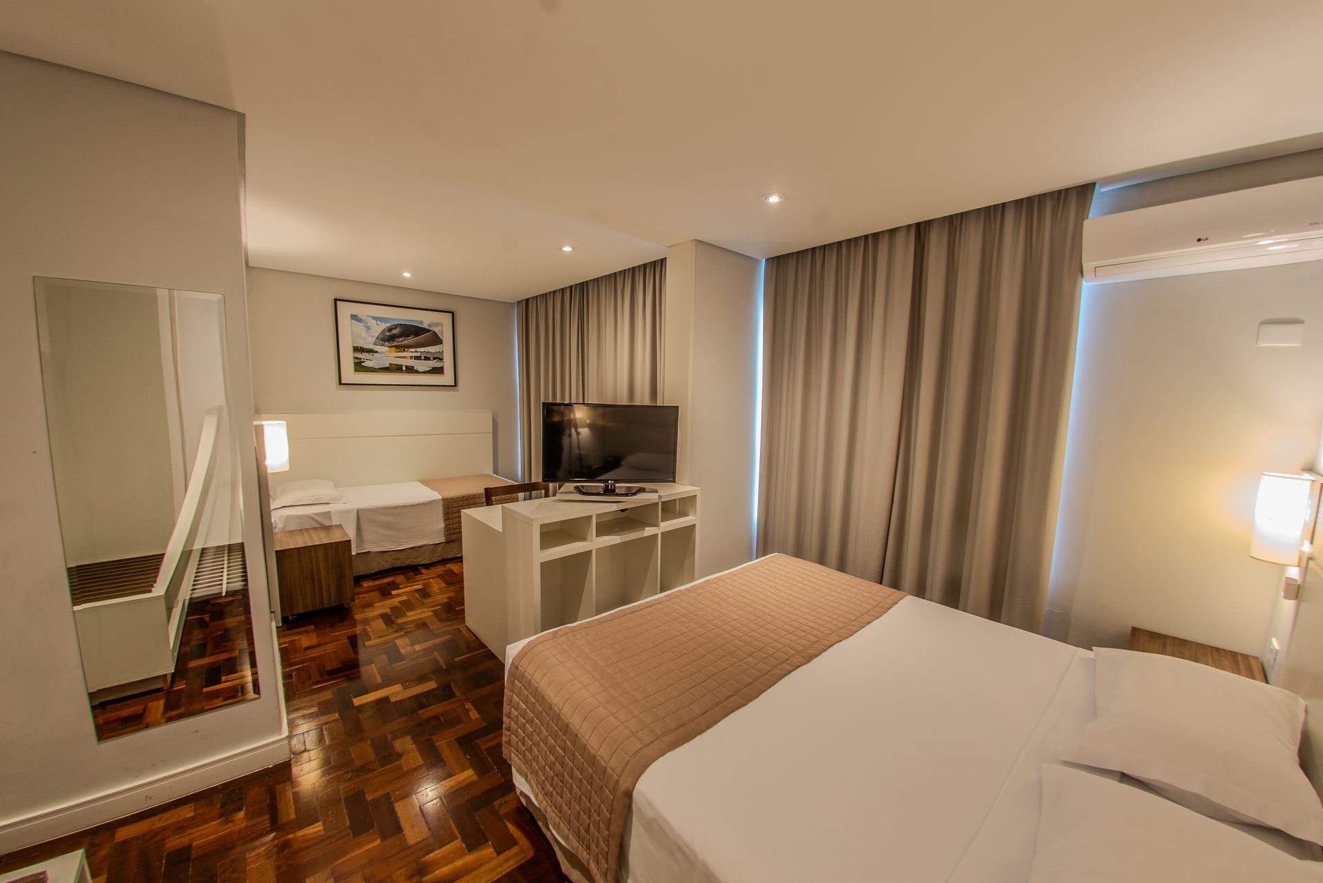 Apartamento com 1 cama box de casal e 1 cama box de solteiro, mesa de trabalho, televisão, ar-condicionado split, cofre e frigobar. O banheiro privativo inclui chuveiro e secador de cabelo.